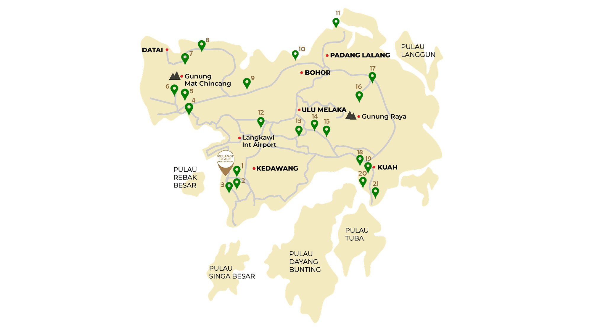 15. MARDI Agro Technology Park 16. Durian Perangin Waterfall 17. Telaga Air Hangat 18. Langkawi Parade 19. MAHA Tower Langkawi 20. Lagenda Park 21. Dataran Lang |